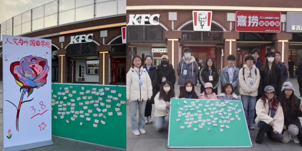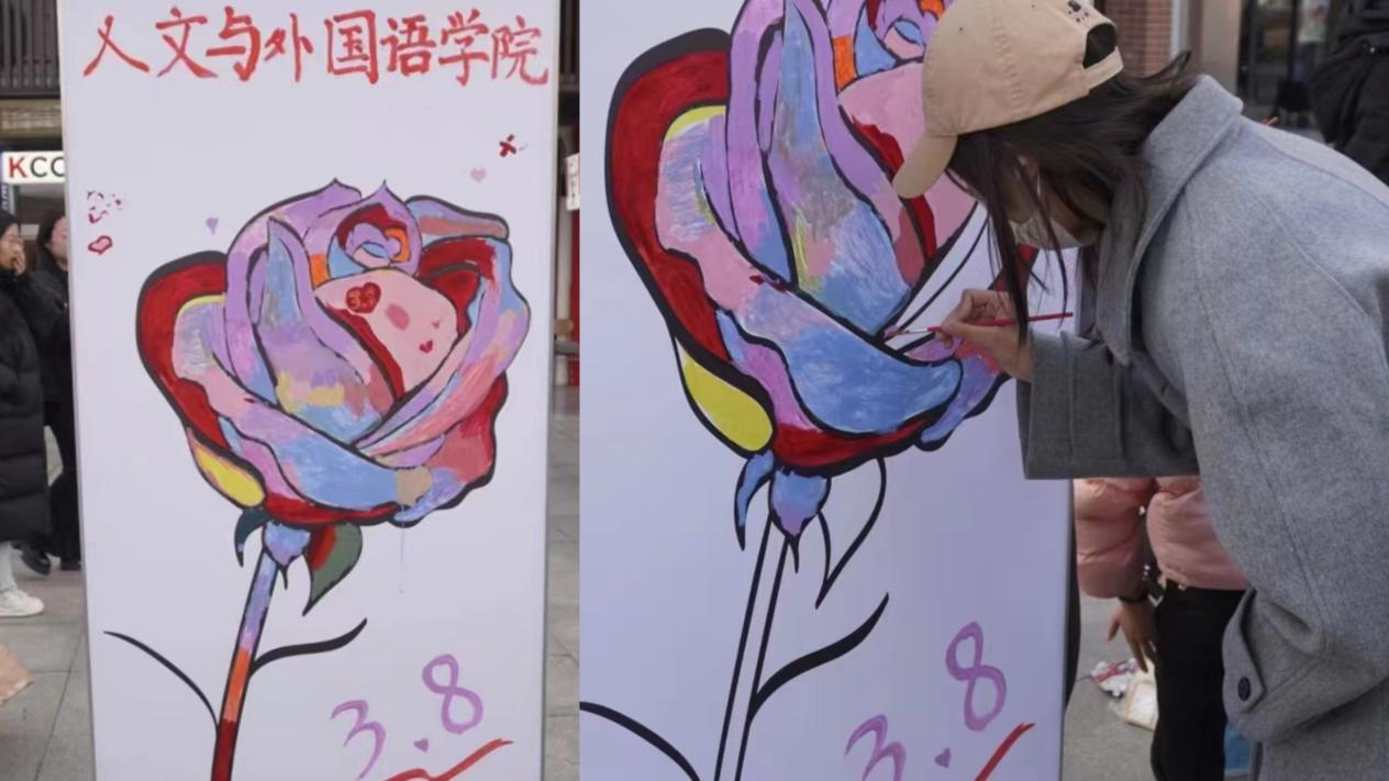 柔肩担重任,巾帼绽芳华。在学生社区,参与者选用在场的任意颜色为立牌的玫瑰花上色,通过多彩的笔触展现出独属于女性的细腻柔软。在一位位同学的精心描绘下,色彩绚丽的玫瑰跃然纸上,彰示着女性的千万种可能。同学们在现场展板处写下对女性的祝福,展现了学生们知美、爱美、会美的美好生活品德,激励学生们以更加饱满的生活热情和昂扬的进取心态开启新学期的学习工作。