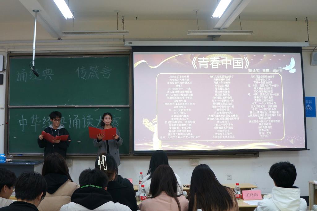 以经典为韵,诗诵千年风雅。为提高青年学子文化素养,激发学生对朗诵艺术的兴趣,以美育人,增强文化自信,展现大学生昂扬向上的精神风貌,3月13日,管理工程学院于主教学楼B221教室举办“诵经典,传箴言”中华经典朗诵比赛,本次比赛由学院新闻中心刘新雪主持,辅导员王俞苹、高鹏磊受邀担任评委。