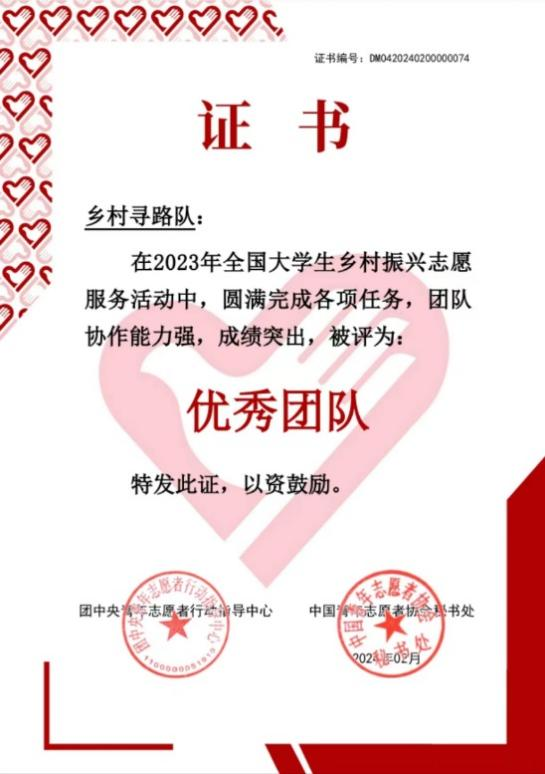 近日,由团中央青年志愿者行动指导中心牵头主办的2023年全国大学生“乡村振兴”志愿服务活动“优秀团队”名单公布,由管理工程学院精心组织的“乡村寻路队”社会实践团队凭借出色的表现,脱颖而出,荣获团中央全国大学生志愿服务活动“优秀团队”称号。