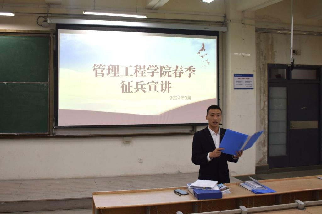 为增强学生爱国情怀,进一步推进学院2024年征兵入伍工作。3月18日,管理工程学院举办春季征兵工作宣讲会,学院团委书记宋晓峰,辅导员李佳妮、崔新江、高鹏磊,各年级学生代表等200余人参加此次宣讲会。