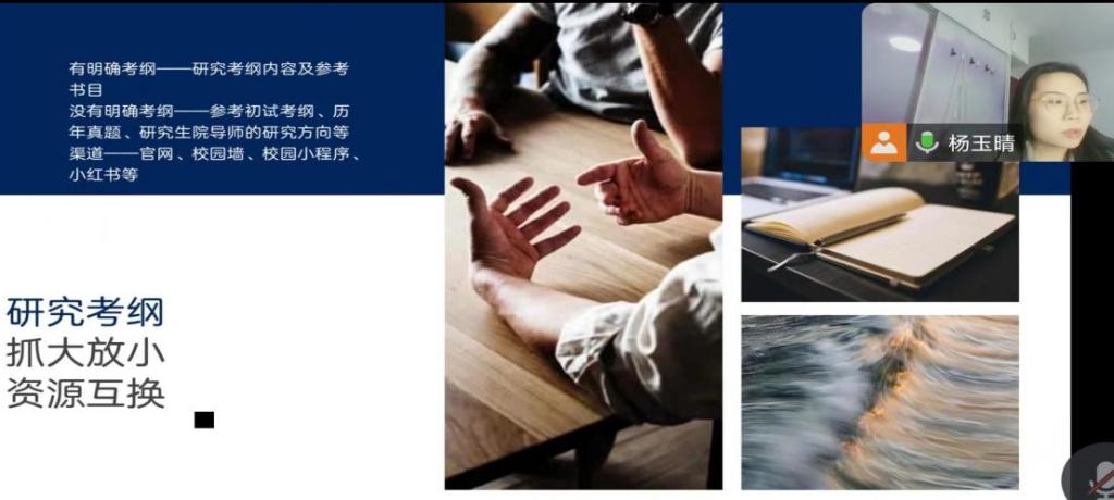 优秀校友经验分享,明确目标方向。3月18日,学院开展线上考研复试培训,邀请了2017级优秀毕业生、现就读哈尔滨工程大学翻译专业学生杨玉晴进行考研复试经验分享。杨玉晴根据自身经验从专业知识、英语口语技巧、心态调整、常见问题等方面进行详细地讲解。在模拟复试环节,杨玉晴担任面试官,按照英语口语面试、自我介绍等环节对考研学生进行一对一的分析指导,让备考学生沉浸式体验研究生复试面试的过程。考研同学高海容表示,通过此次经验分享,不仅掌握了复试的方法、技巧,也充分认识到自身的不足和问题,接下来将针对本次模拟发现的问题进行查漏补缺,以更加饱满的热情迎接即将到来的复试。
