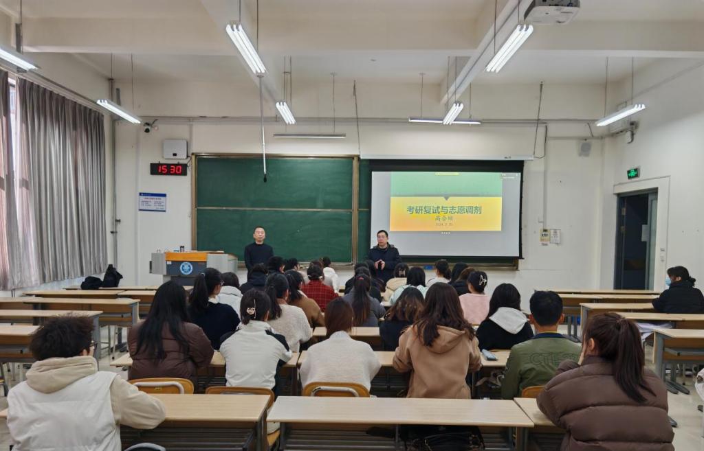提升“文暖”硬实力,做细关怀常态化。学院建立考研学生信息台账,对考研学生复试、调剂进度进行动态更新,及时了解学生需求,在复试前统筹协调开放多个会议室作为备考自习室;学院辅导员、班主任和学业导师对不同分数的考生提供定制服务,积极帮助考研学生联系复试、调剂学校;年级学生骨干、学生党员和保研同学共同组建帮扶团队,为全体考研学生提供“N对1”保障服务,及时共享调剂信息、做好情绪安抚;英语202班同学杨文玉表示,学院能够高效并细致地解决考研学生的困难,让我们觉得考研路上得到很多帮助和支持,感到特别温暖。