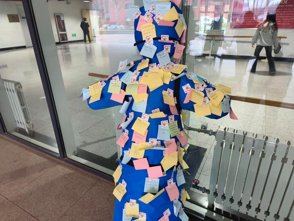活动开始之前,工作人员提前准备好贴有“刻板印象”的假人,以便同学们可以勇敢的撕掉自己所讨厌的标签。一张又一张的标签,是偏见,是束缚,是青春成长中的拦路虎。参与活动的同学们用力撕下自己所讨厌的标签,和自己的困扰说再见,同时也为其他被负面情绪困扰的人送上 “反击”。心中的力量汇聚笔尖,微笑着去战胜一切禁锢着他们的刻板印象,拒绝被定义。