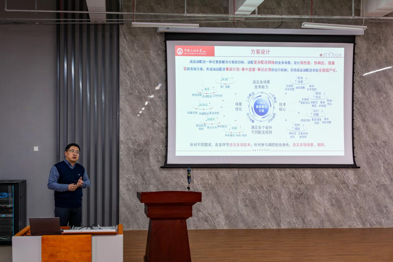 在讲座中,徐小峰老师首先对成品油配送的研究背景进行了详细的 讲解,成品油配送作为我国能源供给链条中至关重要的一环,其需求预测、库存管理和运输调度等环节直接影响着能源供给的安全稳定。然而,当前我国成品油智能配送行业存在诸多弱点:依赖外国软件、系统各环节孤立、末端环节软件过度依赖等。为解决这些问题,徐小峰老师团队构建了一体化智能解决方案,旨在实现系统全面国产化,提高系统性能和运行效率。该解决方案涵盖了“库存决策-路径优化-运行预警-实时调度”等多个关键环节,旨在适应复杂的配送网络,提高系统的性能和响应速度。在实施阶段,徐小峰老师团队对合理库存管理、优化油罐销售、提升配送效率等五个方面依次提出了解决措施。最后徐小峰老师展示了模型算法,至今,该模型算法已在全国多个省市上线测试。
