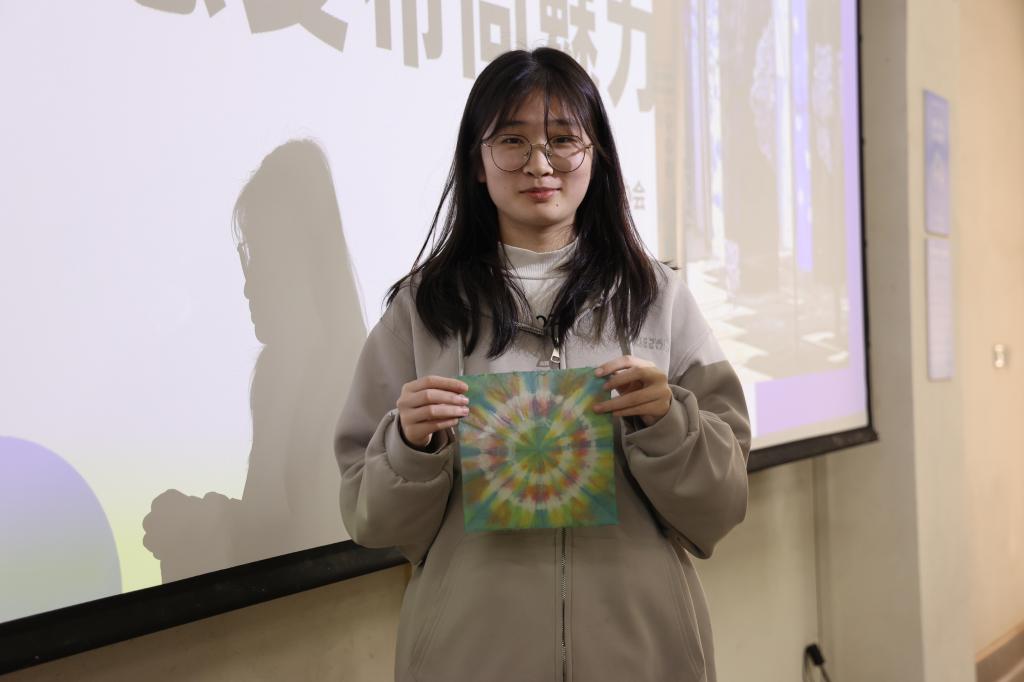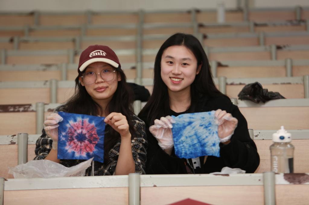 活动中,高昕越同学向大家讲解了扎染的起源与分布,与大家共同欣赏了非遗传承大师的扎染作品,体会到了扎染的独特魅力。随后同学们使用植物染料和棉布手帕进行了染制,通过纱、线、绳等工具,对织物进行扎、缚、缀、缝、夹、包等方式扎结后,再进行染色,将布料取出清洗干净并拆线展开即形成美妙的图案,如其中的“卷上绞”晕色丰富,变化自然。