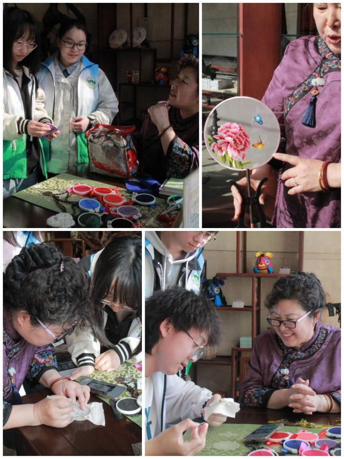 “齐绣作为鲁绣的分支,距今已有2000多年的历史,传统的齐绣以蓝色、紫色等色调为主,有盘金绣、平绣、双面绣、乱针绣等多种针法,每幅作品针法不同,就会产生油画、水墨画、工笔画等各种效果,齐绣绣工精细,很有地域特色。”齐绣非遗传承者黄凤老师的弟子刘老师向志愿者们介绍道。常龄玉作为学生代表,深入学习了齐绣工艺技艺,在非遗传承人刘老师的指导下,经过一针一线、一穿一绕,以针代笔,以线为色,一个精美的荷包呈现在大家面前。常龄玉同学表示,“在刺绣的过程中,我的内心慢慢变得平和,在这一针一线间我感受到中华传统文化的魅力,更加体会到劳模工匠身上执着专注、敬业奉献、追求卓越的精神品质。”