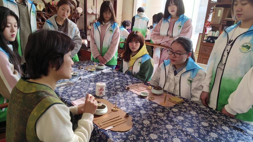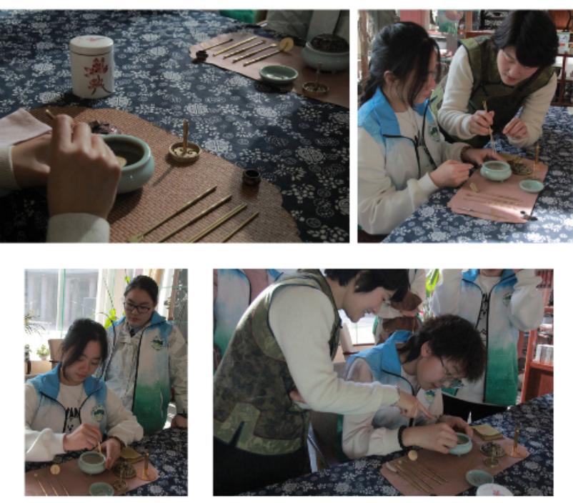 捣松香灰、压实香灰、清扫余灰、放置篆模、放置香粉、铺平香粉、起篆、点香,这其中的每一个步骤都是对篆香者性情的考量:摆香具讲究礼仪,压香灰考验耐心,放香篆落篆无悔,填香粉讲求扎实,起香篆手法要稳,点香时香不接触……香学孙琳琳老师从中国和香文化的起源、发展、构成、传承等方面,为同学们深入浅出地讲解了和香的知识和内涵,让同学们对香文化有更深入的了解和认识。在轻柔悠扬的音乐伴奏下,将篆香的艺术美感展现得如诗如画,姿态优雅端庄,令人陶醉。学生李新颖表示,“十分荣幸能与孙老师一同追寻古今香事的脚印,了解博大精深的中国传统和香文化,学习亲手做一炉香,静心修身,细品香味,体会香道带来的优雅自己、悦己悦人的美好感受。”