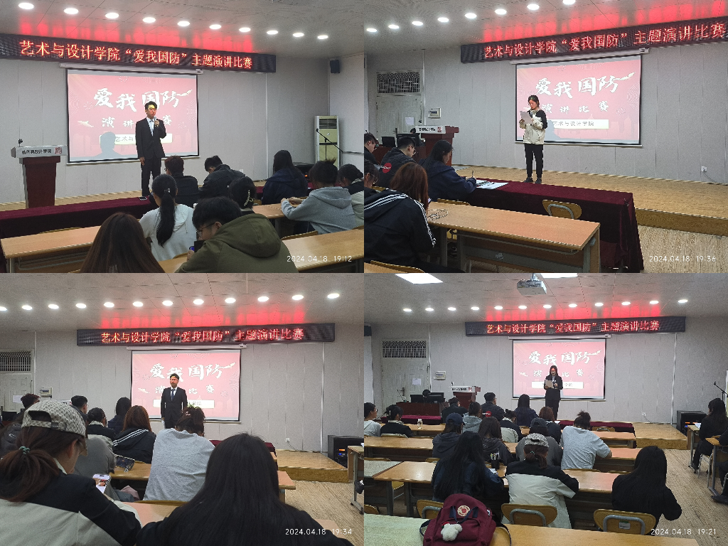 为激发加强当代大学生强国强军的责任担当,增强全体师生爱军拥军的国防意识,4月18日,艺术与设计学院在市北校区2教416成功举办了“爱我国防”主题演讲比赛。本次比赛由环设231班刘佛根和邹彤同学主持,评委由2021级辅导员苏恒、学生代表团委副书记王亮、伯牙室内合唱团团长乔虹组成。
