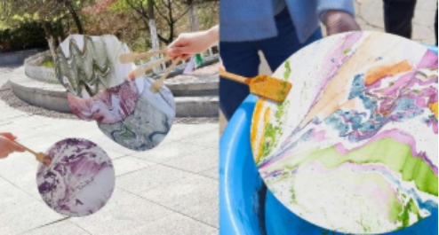 漆艺斑斓映日月,团扇轻飘绘春色。非遗漂漆团扇体验活动区,吸引了众多学生驻足参与。活动现场,同学们根据个人的喜好选择颜料并将其滴入水中,在水面勾画出自己喜欢的图案,并将扇子以或上下、或左右、或旋转的方式缓慢地放入水中,让颜料自然地吸附在扇面上,形成独一无二、不可复制的画面。待扇面上的颜料干透后,再进行后续的漆艺处理,使图案更加鲜明且耐久。经过最终打磨和点缀之后,一幅幅精美的漆扇作品呈现眼前,漂漆扇摇曳出的不仅是凉爽的微风,更演绎出中华传统美学的独特魅力。