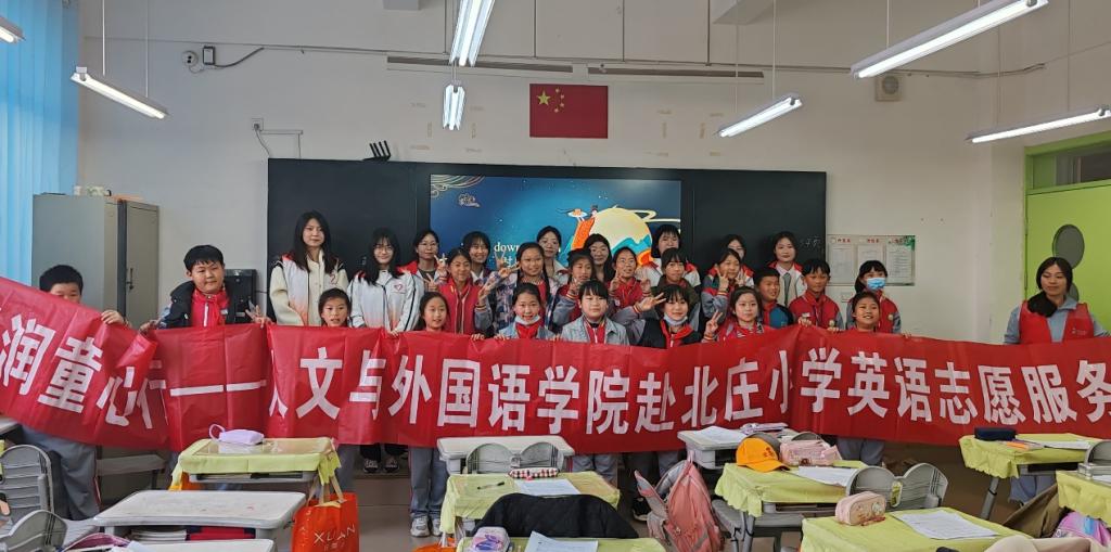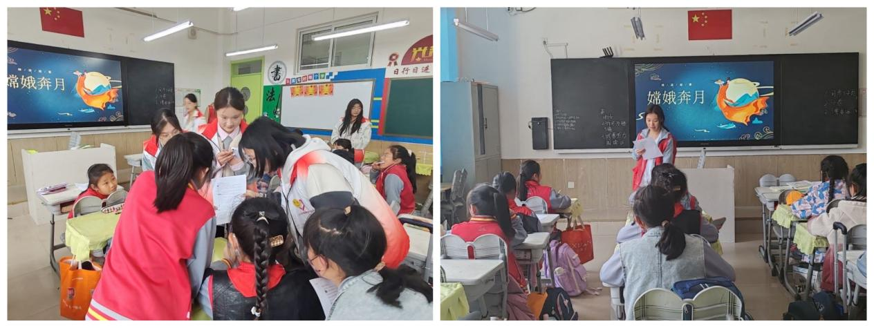 “悦”读英语,演绎精彩。学院“语润童心行”志愿服务团走进北庄小学,以英语阅读和创意课堂为特色,带领孩子们双语阅读嫦娥奔月的美丽传说,并让孩子们根据自己对故事的阅读理解进行现场英语话剧表演,用表演表达角色的情感与心声,进一步增强学生对阅读内容的理解,提升语言技能。