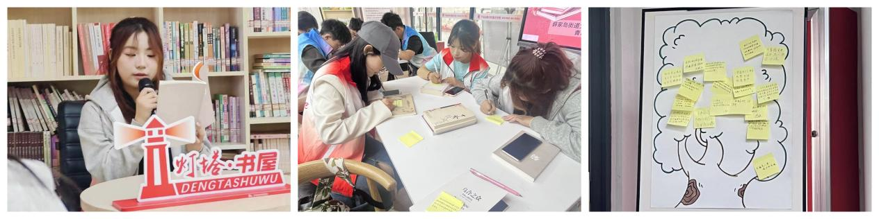点亮灯塔书屋,共建书香阵地。学院团委联合华顶山路社区开展“点亮灯塔书屋,共建书香阵地”世界读书日社区实践活动。活动中,学院志愿者们和社区居民分享书中的片段和蕴含的道理,引导居民们认识阅读的价值,鼓励居民培养持续阅读的良好习惯。交流讨论环节中,大家积极踊跃地发表阅读感受,并在便笺纸上写下自己的阅读心得,现场气氛热烈。