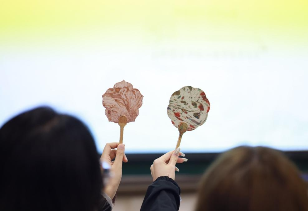活动开始,主持人向同学们介绍了漆扇的历史与其所蕴含的重要文化意义,并通过视频向同学们讲解了漆扇的制作过程及成品。活动中,各位同学充分发挥自己的想象力,用竹签轻轻挑动,让漆液在扇面上流淌、扩散,形成独特的纹路和图案。学生们都深感漆扇匠心独运的魅力以及中华民族传统文化的博大精深。