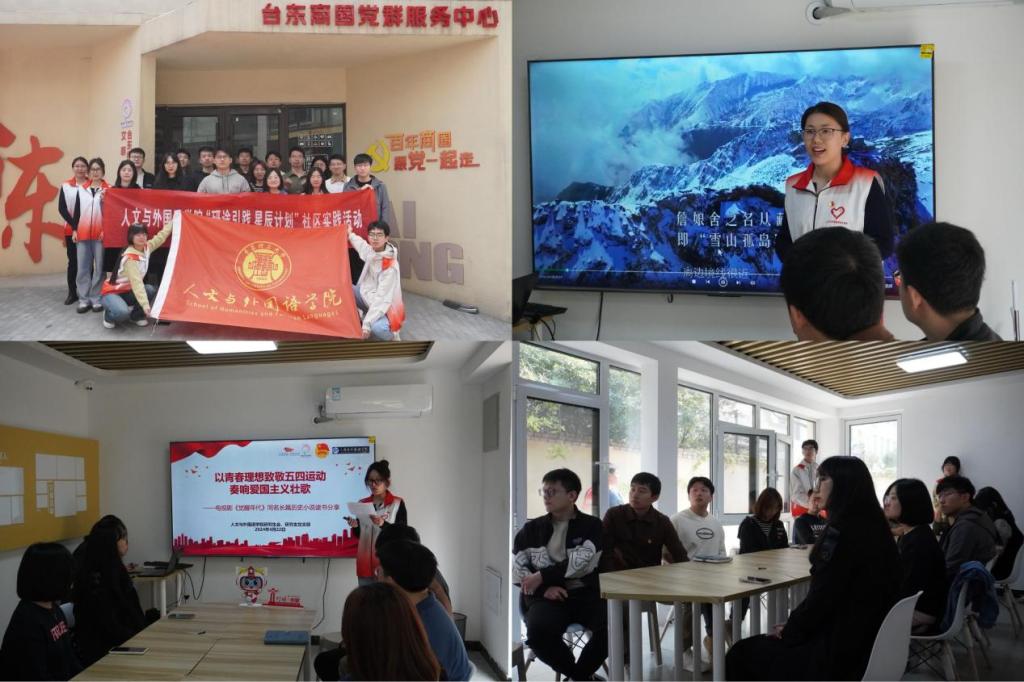 “他们最爱说的话是:祖国知道我!……这就是中国军人的魂魄!”宣讲团成员杨雅斐讲述着新时代五四精神故事《詹娘舍哨所——不朽的雕像》,激情的演讲配合逼真的情景、振奋人心的影片和磅礴雄浑的配乐,让听众仿佛穿越到连雄鹰也难以飞越的詹娘舍哨所。近日,人文与外国语学院团委组织“红色之声”宣讲团成员分别前往南岛社区、台东商圈党群服务中心开展青春心向党“五四”青年节红色宣讲活动,他们以五四青年精神为讲稿,以青年阵地为讲台,以青春视角设计沉浸式宣讲,用青言青语讲好中国故事,成为五四精神理论宣讲先锋军,彰显人外学子们“一心向党、逐梦青春”的昂扬斗志。