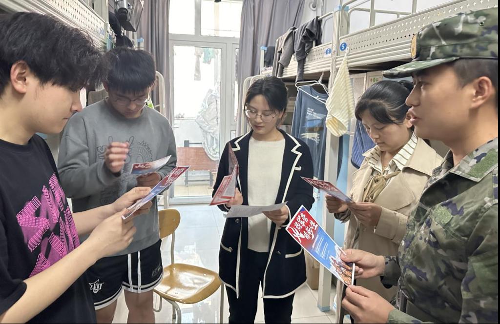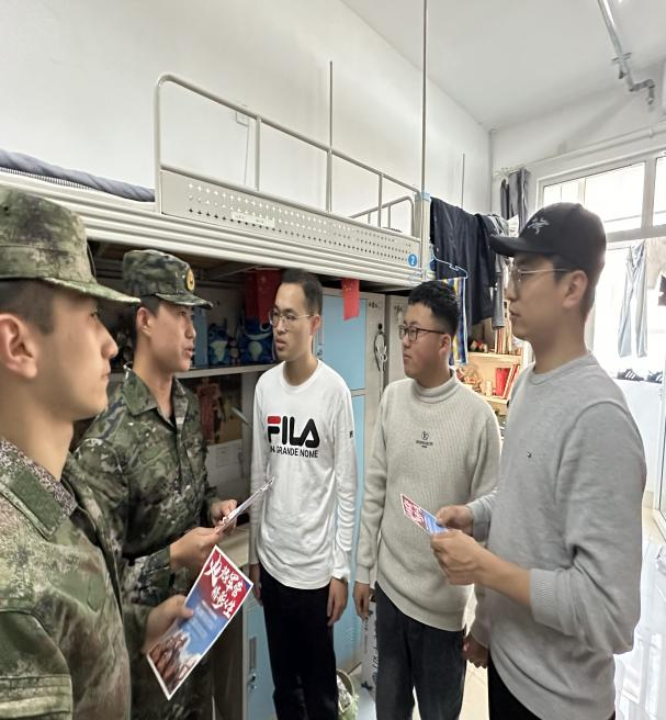 宣讲团成员走进学生公寓,发放征兵宣传手册,为同学们讲解征兵政策,重点就参军入伍条件、报名流程及体检时间等作了详细解读,并为有疑问的同学积极解答相关问题,解除大家的后顾之忧。退伍学生分享军营生活的收获感悟,让同学们更加直观地感受到军营的魅力和挑战,鼓励同学们抓住机遇,响应号召,投身军营,报效祖国,以蓬勃的青春力量展现新时代大学生的挺膺担当。