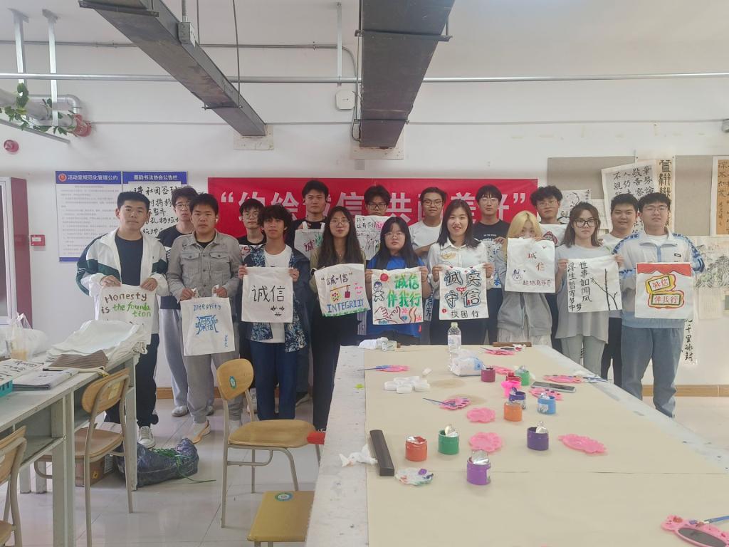 活动包括诚信标语设计和帆布包DIY绘画设计。诚信标语设计以设计诚信标语为主要内容,同学们写出代表诚信的标语,表达诚信做人、诚信做事的意愿;在“约绘诚信,共画美好”为主题的帆布包DIY绘画设计活动中,同学们发挥想象力和创造力在帆布包上绘制与诚信相关的图案,在活动中认识诚信的重要性,树立诚信品格。