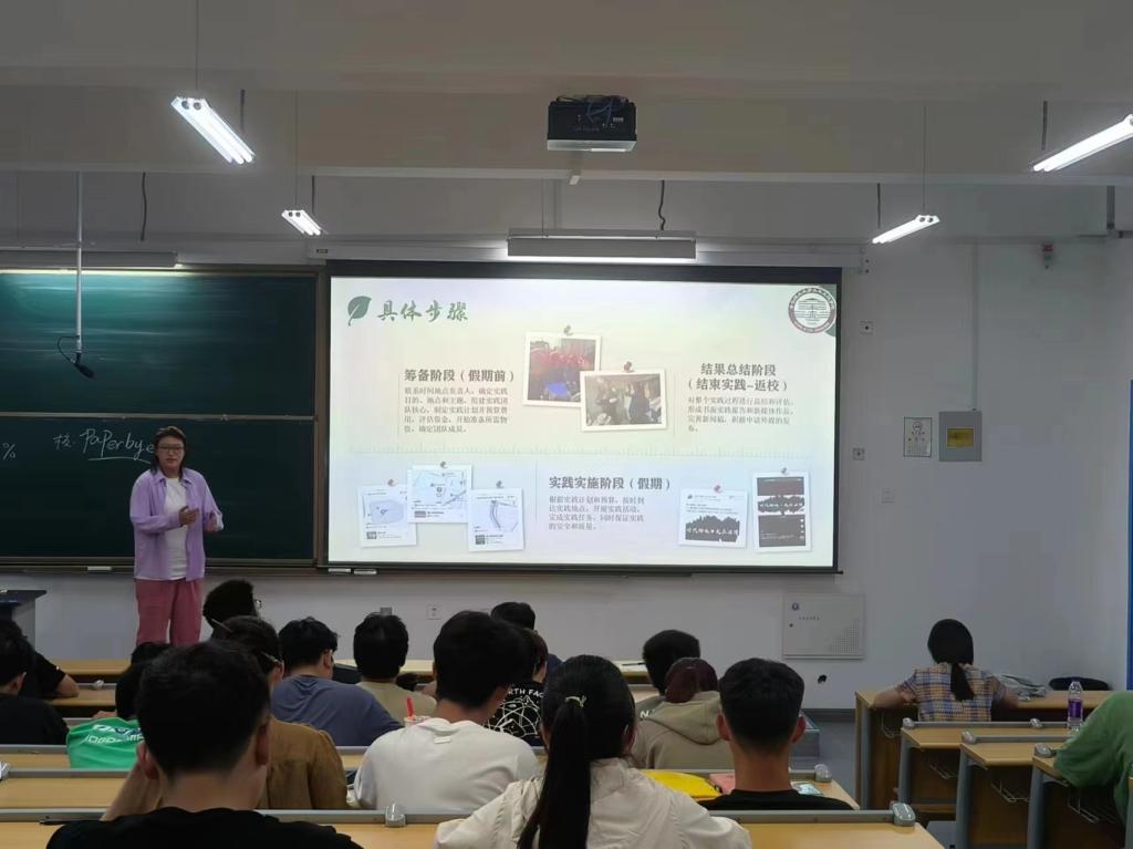 辅导员张杰从“什么是大学生社会实践”“了解社会实践的类型”“开展社会实践的具体方法”等方面,为同学们进行讲解。鼓励同学们走出课堂,走出校园,走向社会,将所学知识应用于实际,通过实践活动提升社会责任感和实践能力。