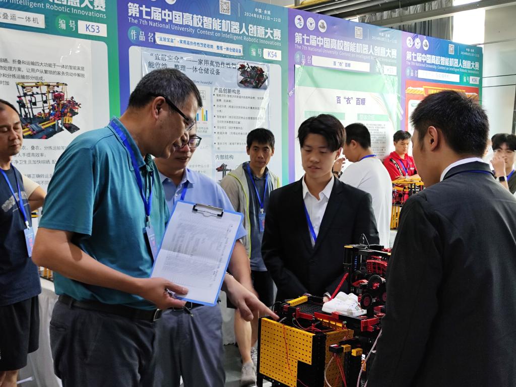 在第七届中国高校智能机器人创意大赛主题赛中,我校学生的参赛作品主要集中在模块化产品搭建组,经过现场展示与答辩,“家庭快餐--家用式餐具清洗及食材预处理集成一体机”(学生:刘雨霏、仲世哲、董骐瑞)与“味界智绘师--智能果蔬沙拉机”(学生:杨俊辉、尹志鹏、刘文洁)两项参赛作品获得国赛一等奖,“一种基于机器视觉自主学习的果蔬洗切一体机器”(学生:王俊豪、韩荟、丛旭威)、“宠趣管家--智能宠物护理机器人”(学生:王巡、陈聪迎、王振翔)、“清洁之道:一机三系统,洗烘一体智能鞋履护理新标杆”(学生:杨俊毅、刘彦成、常车乐玺)等参赛作品获得国赛二等奖。“全域洁净--面向狭窄场地的多轴轮式地面清洁机器人”(学生:仲世哲、董骐瑞、刘雨霏)、“养花无忧机—基于物联网控制系统的多功能室内花卉盆栽智能培育装备”(学生:李静、周科振、张正志)、“服药智伴多功能智慧理药机器人”(学生:黄泽楠、范弘昊、王轩)、“基于越疆机械臂的老人智能药箱”(学生:张菡森)等参赛作品获国赛三等奖。