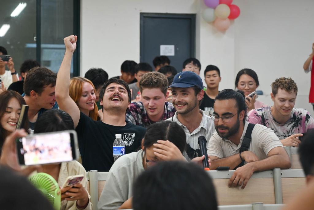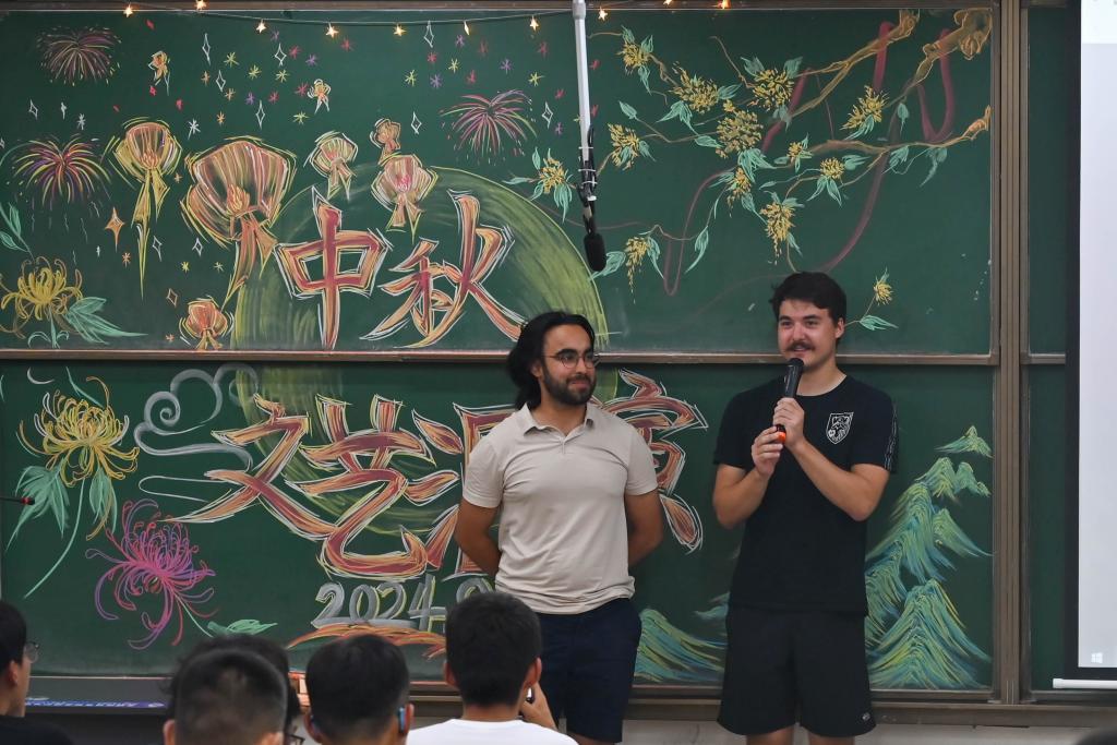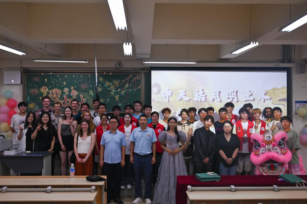 与此同时,晚会的现场来了一批特殊的嘉宾——来自德国的交流生们。他们也被这种温馨、浪漫的氛围所动容,特意上台合唱歌曲并用中文“祝大家中秋快乐!”表达他们最真挚的祝福,将晚会气氛推向高潮。