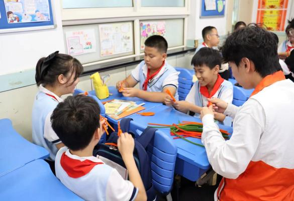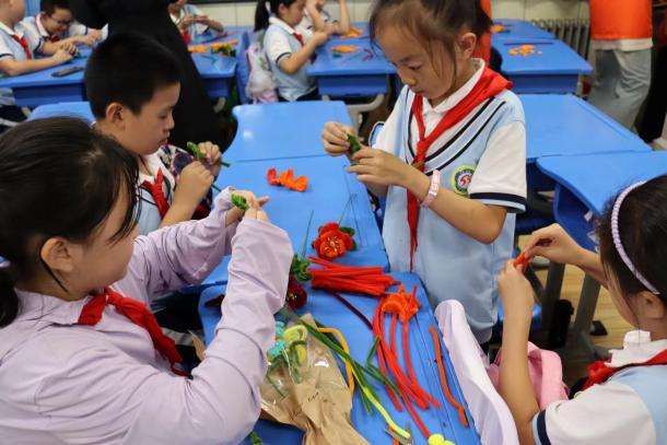 志愿服务中心学生环设234班陈青禾对此次活动深有感触,她表示看到自己带领小朋友将手中的材料从最初的单一物品逐渐变成一朵朵色彩鲜艳的编织花,她感到十分开心。她与小朋友将制作的花束命名为“永不凋谢的花束”,不仅体现了对祖国的美好祝愿,亦体现了为非遗文化传承发展贡献自身力量的青年担当。