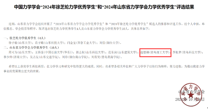 近日,山东省力学学会官网公布“2024年山东省力学学会力学优秀学生”获奖名单,我校理学院工程力学专业首届本科生赵慜婧荣获该奖项。