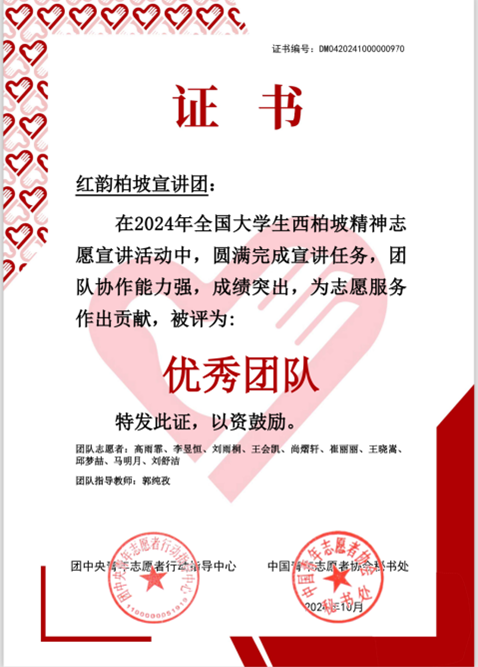 近日,团中央青年志愿者指导行动中心、中国青年志愿者协会联合公布了2024年“西柏坡精神”全国大学生志愿宣讲活动“优秀团队”名单,我校管理工程学院红韵柏坡宜讲团圆满完成宣讲任务,团队协作能力强,成绩突出,为志愿服务作出贡献,被评为“全国优秀团队”。