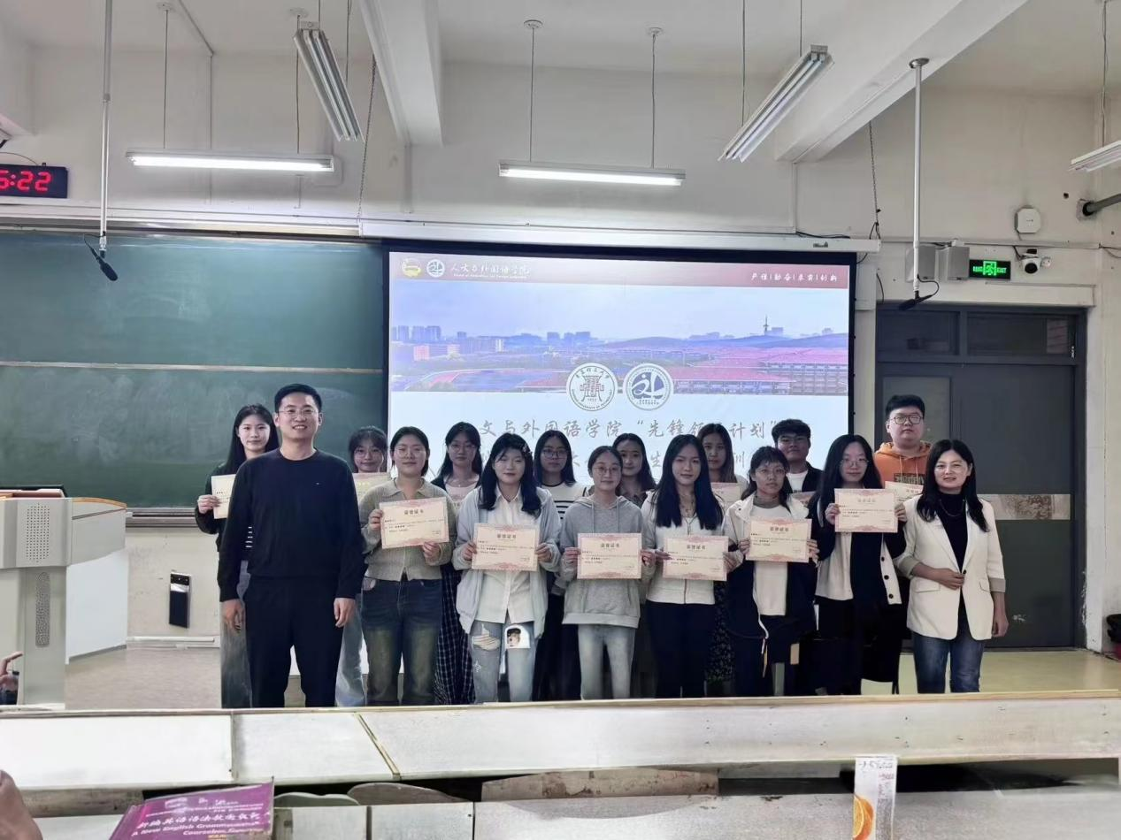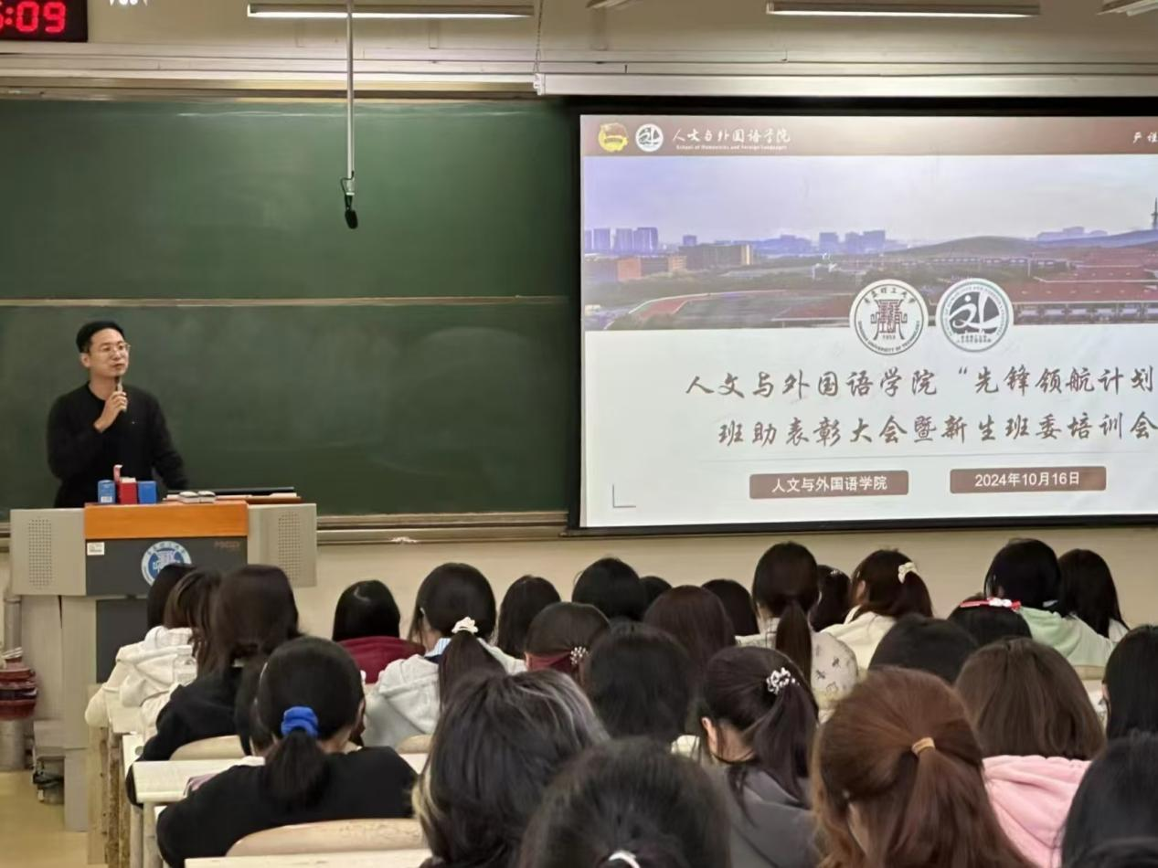为进一步强化2024级新生班级、团支部组织建设,不断增强班委思想意识和工作能力,10月16日下午,人文与外国语学院于主教学楼B104召开“先锋领航计划”表彰大会暨新生班委培训会。学院团委书记徐卫晓、2024级新生辅导员王才升、新生班助、全体新生班委和宿舍长参会,会议由王才升主持。