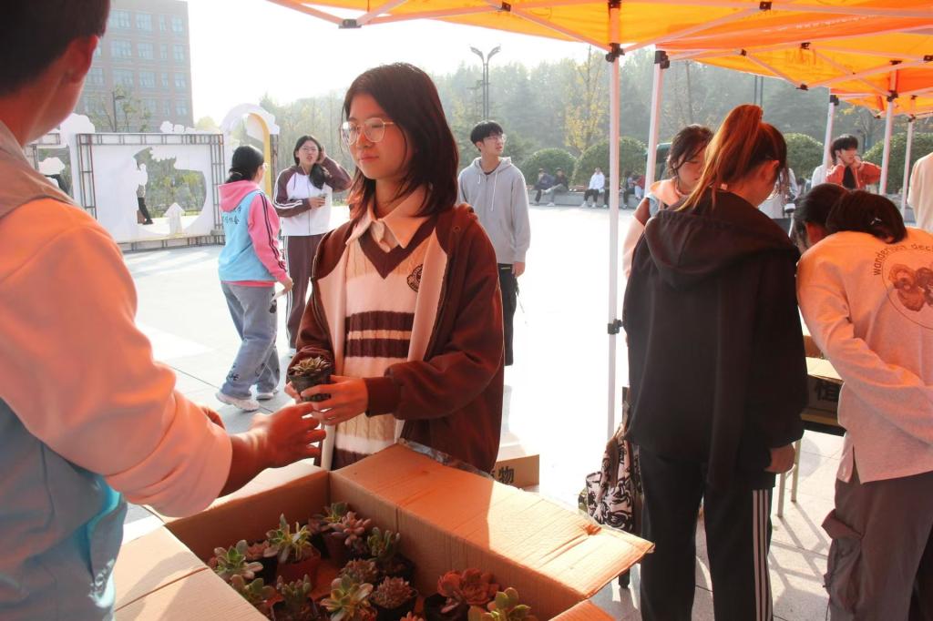 此次活动以线下形式展开,受到同学们的广泛关注和支持。活动开始后,同学们到达礼贤广场签到并领养自己喜欢的绿植,现场气氛十分热闹,同学们讨论着自己领养的绿植,并与之合影留念。值得一提的是,上学期备战考研参加过领养活动的学长学姐们重赴活动现场与学弟学妹们分享绿植养护方法以及推免成功的喜悦。