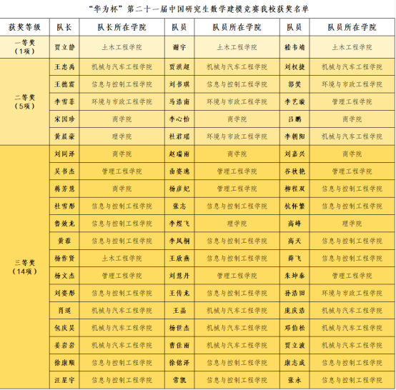 经过中国研究生数学建模竞赛专家委员会近两个月的评审,由沈亮老师指导,宋国珍、李心怡、吕鹏3名研究生组队参赛的项目获全国二等奖;由徐晗筱老师指导,刘同泽、赵瑞雨、刘嘉兴3名研究生组队,由蒋芳慧、杨彦妃、柳程双3名研究生组队分别荣获全国三等奖;七支队伍获成功参赛奖。
