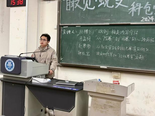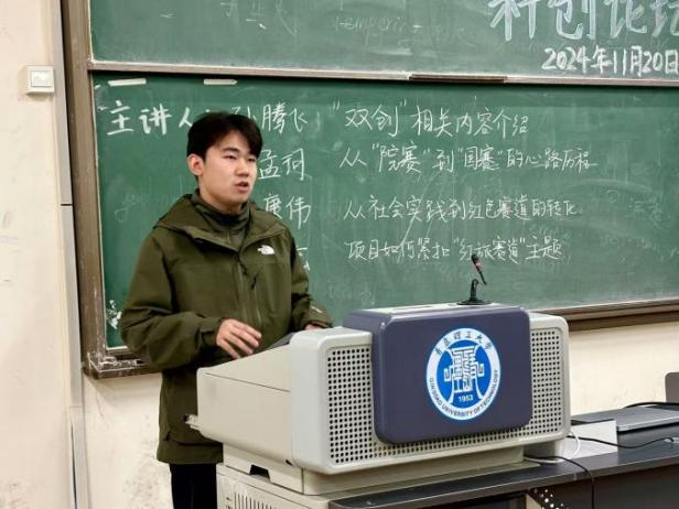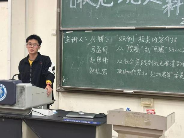 孙腾飞介绍了“双创”相关内容,围绕“什么是大学生学科竞赛”“为什么要参加大学生学科竞赛”“具体赛事有哪些”以及“赛程安排与答辩要求”四个方面进行介绍,使在场学生对“双创”有了基础的认识,激发同学们的科创兴趣。马孟珂围绕“互联网+比赛章程”“案例分析”和“团队比赛章程”三个方面分享了自己从“院赛”到“国赛”的心路历程。她以团队成员为了提升汇报效果修改100多版PPT为例,强调团队成员要有团队精神,不怕麻烦、精益求精,才能呈现出优秀的作品。赵康伟围绕挑战杯红色专项赛事进行经验分享,从比赛简介、材料基础、实践方式、参赛经验四个方面,由浅入深地进行介绍,使在场学生加深了对红色专项赛事的认识。他强调小组成员应分工合作,各司其职,发挥所长。钟杭宏则着重介绍了红旅赛道概论、特点、成功案例、备赛方向等内容,鼓励广大同学结合专业特点和优势积极备赛,打造种子项目。