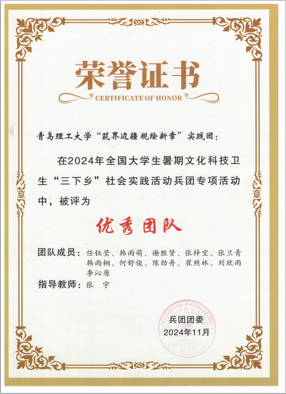 近日,由共青团新疆生产建设兵团委员会主办的“2024年全国大学生暑期文化科技卫生‘三下乡’社会实践活动兵团专项活动”优秀团队名单公布。在学校团委的支持培育下,建筑与城乡规划学院“筑界边疆·规绘新章”实践团获评“优秀团队”。