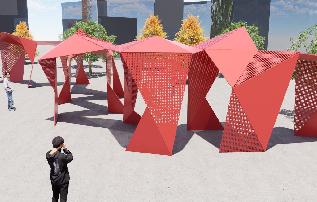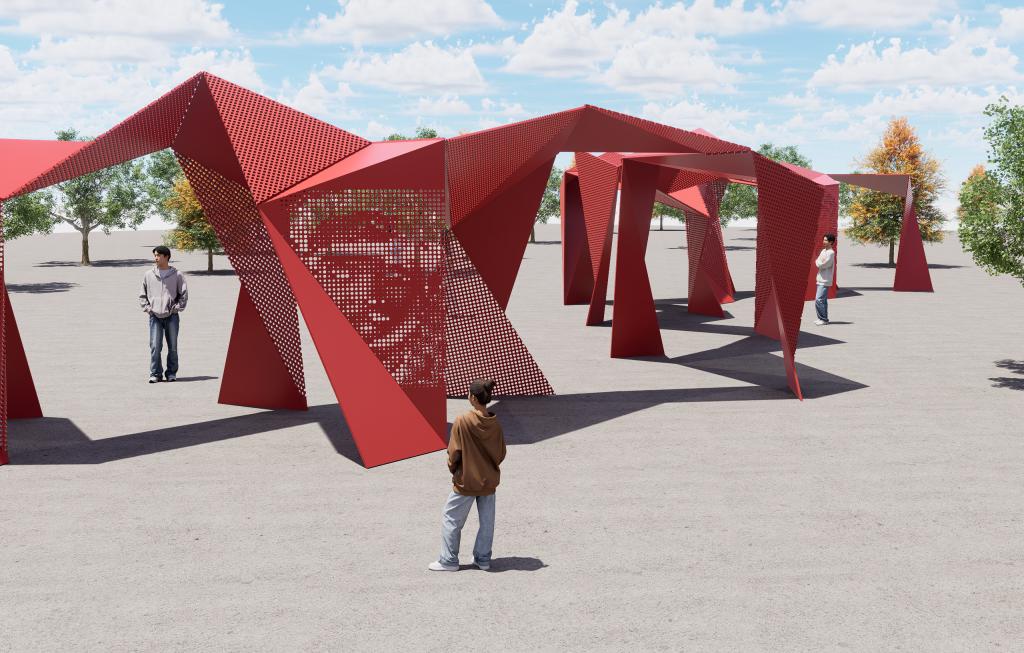 团队成员深入实地进行走访、访谈,通过考察调研发现,新疆生产建设兵团历史悠久,精神内涵十分丰富,但由于缺少系统性的规划设计,红色文旅资源整合度不够高,各景区之间缺乏深度串联与协同推广,难以形成规模效应与完整旅游线路;同时部分城市开发相对较晚,没有系统性的规划设计。因此,团队在深入了解各师的主要需求后,精心设计了可用于新疆生产建设兵团的可复制景观装置“名人画像穿孔板”与“红色丝带”景观装置连接,设计摆脱传统展览装置的套路化设计,以“红色丝带”引导参观者了解红色文化,增强景观装置的互动性和视觉冲击力、用线性景观代替点状景观,尝试探索具有创新性红色“场域”的景观模式。针对第七师胡杨河市这座共和国第三年轻的城市,团队成员依托城乡规划专业特长,提供城市近期、中期与远期的整体发展规划,为城市的基础建设与经济发展提供理工智慧。团队成员的优异表现,受到了共青团新疆生产建设兵团委员会认可,最终获评“2024年全国大学生暑期文化科技卫生‘三下乡’社会实践活动兵团专项活动”优秀团队。