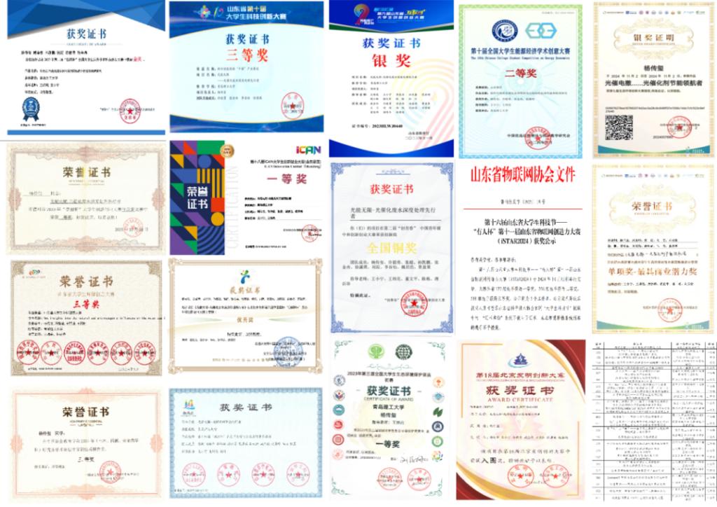 值得一提的是,由博士研究生杨传玺牵头组织的“博思创新队”竞赛团队是由一群志同道合的本研学生自主组队,来自学院各个专业与年级。在学院的鼓励与支持下,杨传玺带着团队成员们积极投身科研与竞赛,学生们共同研究、互相协作、一起成长,既锤炼了创新能力,也提升了科研实践水平,充分展现了学院在学术创新与科技竞赛中的引导作用。团队连续两年获得“创祎杯”全国大学生课外学术科技作品大赛金奖三项,并在中国国际大学生创新大赛、“挑战杯”山东省大学生创业计划竞赛、北控水务杯第七届大学生生态环境创新大赛、全国高分子材料创新创业大赛、iCAN大学生创新创业大赛、全国环境友好科技竞赛等十多个全国赛事中获得多项国家级、省级奖项。这些成绩不仅展示了学生们的创新能力和团队精神也体现了学院在培养学生科研兴趣、营造浓厚科创氛围方面的重要作用。学院开放、鼓励和支持的科创文化,激发了学生们的自主学习和创新动力,成为他们不断探索、勇于创新、成就自我的强大推动力。