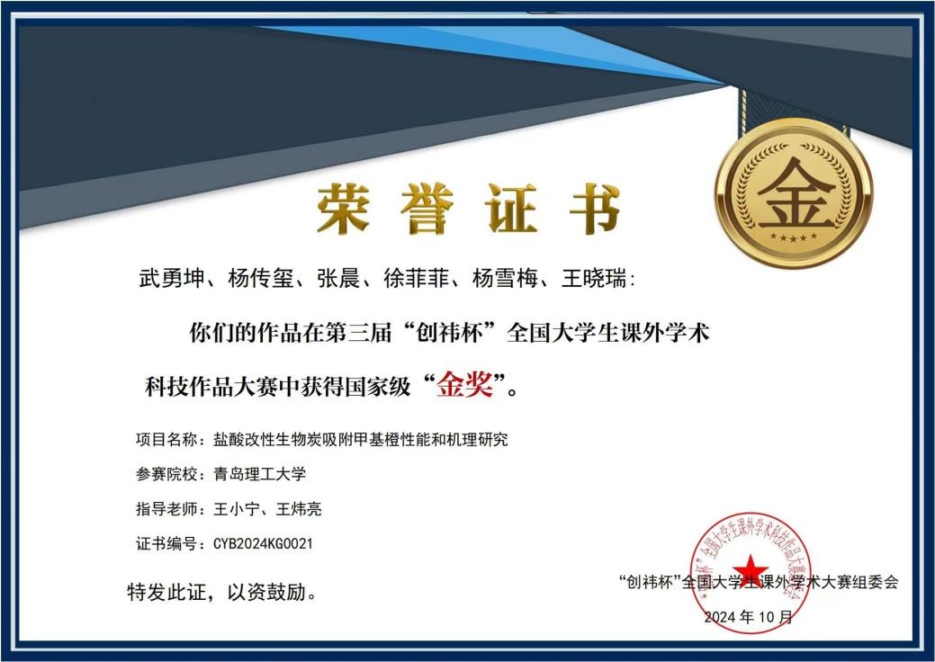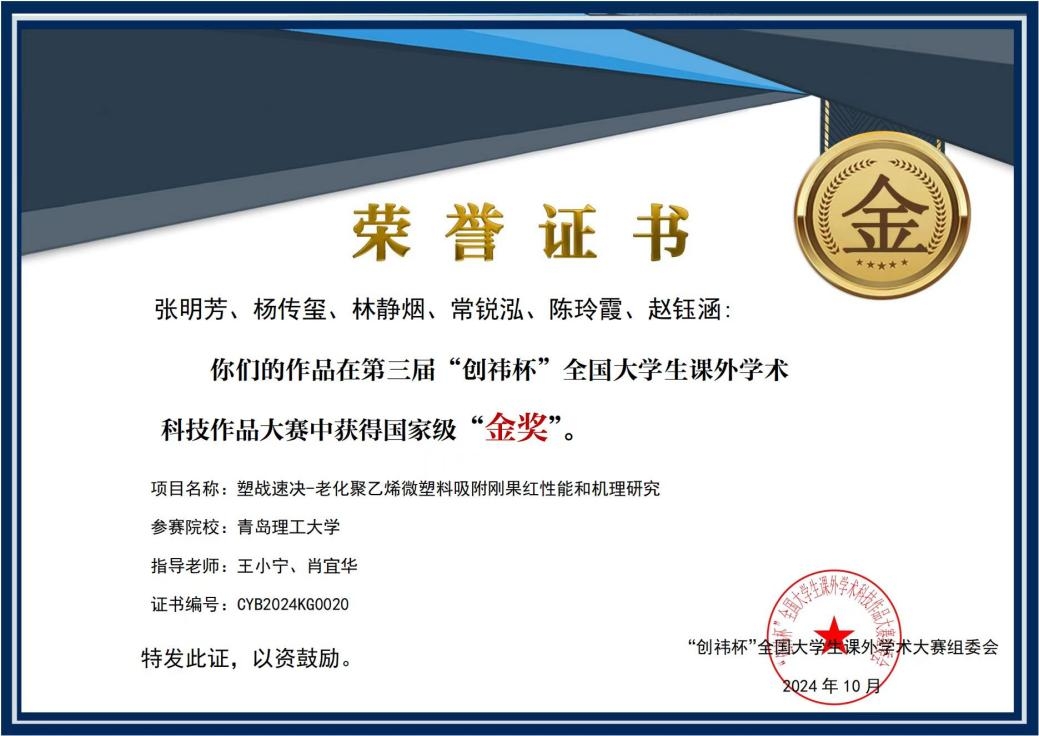 近日,在第三届“创祎杯”全国大学生课外学术科技作品大赛全国总决赛中,我校环境与市政工程学院学生再次取得优异成绩。由教师王小宁、肖宜华、王炜亮指导,博士研究生杨传玺组建的“博思创新队”竞赛团队,经过多轮激烈角逐,凭借其卓越的科研创新和团队协作,两件参赛作品《塑战速决-老化聚乙烯微塑料吸附刚果红性能和机理研究》(负责人:本科生张明芳、博士杨传玺)《盐酸改性生物炭吸附甲基橙性能和机理研究》(负责人:本科生武勇坤、博士杨传玺)荣获两项国家金奖,参赛两年来该团队在本赛事累计获得了全国金奖三项。