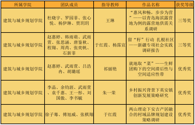 “耳闻之不如目见之,目见之不如足践之”,在暑期社会实践活动中,建院学子以行动为笔,基层为纸,践行“建形之尊,筑美于魂”的院训精神,将论文写在祖国各地,充分体现了新时代建筑人才实践育人的成效。其中,“惠风和畅,步步为营”——以青岛海滨露营地为例的露营地供需关系报告以露营者的空间行为为依据,选取青岛市典型的滨海露营空间,从“功能分区、基础设施和公共服务、安全管理、景观设计”四个方面,运用层次分析法、地理信息系统分析、空间句法以及API分析方法对海滨露营地进行调查研究,为城市海滨露营空间的建设提供借鉴。留“籽”行动 扎根社区——新疆专项社会实践调研报告,通过调研聚焦于新疆的文旅夜游资源,设计夜间文化、旅游、娱乐和餐饮消费项目,以助力伊犁民族特色文化街区的高质量发展,为区域发展提供有益的参考与建议。两份调研报告通过赴基层实地调研,掌握第一手资料,真实的反映基层实际情况,提出了具有可操作性的解决实际问题对策建议,最终获得省级三等奖。另学院乡村振兴背景下英安镇创新发展策略研究、就地取“菜”——生鲜团购下的空间滞后性与空间适应性带调查研究、两山理论下安吉产居融合的村域品牌规划建设策略调研报告获得省级优秀奖。