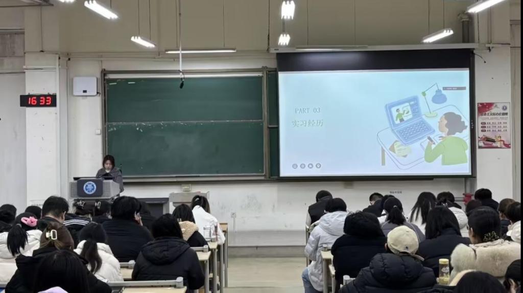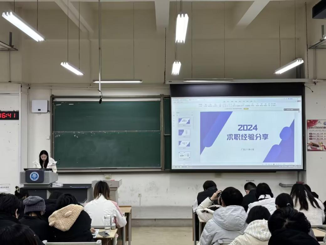 最后,毕业生李繁荣和黄心莹作经验分享,她们结合自身求职经历分别从职业规划、求职渠道拓展、简历与面试技巧以及心态调整等几个方面为同学们就业提供实用技巧和建议,着重提醒同学们要把握好校招时机,主动争取就业机会。