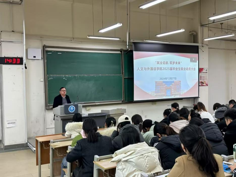 为全面落实上级就业政策、推动2025届毕业生就业工作,引导毕业生树立正确的就业观念,提高就业积极性和主动性,12月27日,人文与外国语学院在主教学楼B301开展“就业启航,筑梦未来”2025届毕业生就业动员大会。学院党委书记王粲、副院长王星,团委书记、学工办主任胡彤以及2025届全体毕业生参加。会议由毕业生辅导员扎西央宗主持。
