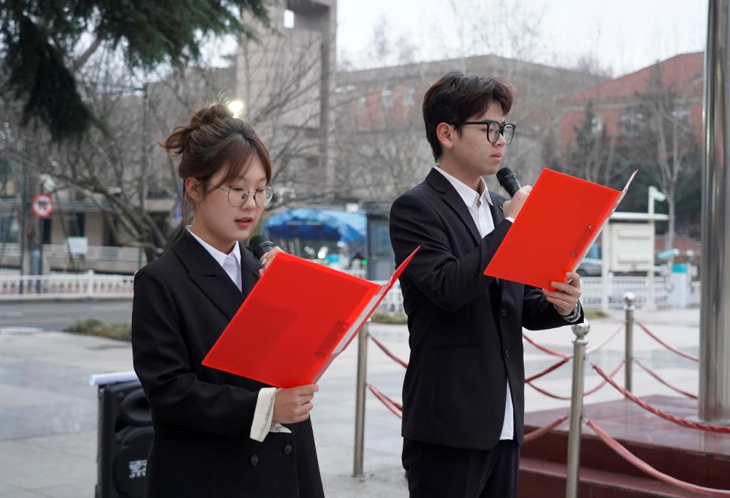艺术与设计学院学生耿硕、戴文洲在国旗下向全体同学深情朗诵《永恒的时代灯塔》。激昂的诵读声中,号召新时代新青年,要脚踏实地,践行雷锋精神,不负青春韶华,勇担责任使命。学生赵若琪以《星光璀璨,精神永存》为题,讲述青春故事,动员同学们笃定信念,做新时代雷锋精神的倡导者;主动志愿,做新时代雷锋精神的践行者;艰苦奋斗,做新时代雷锋精神的传承者。