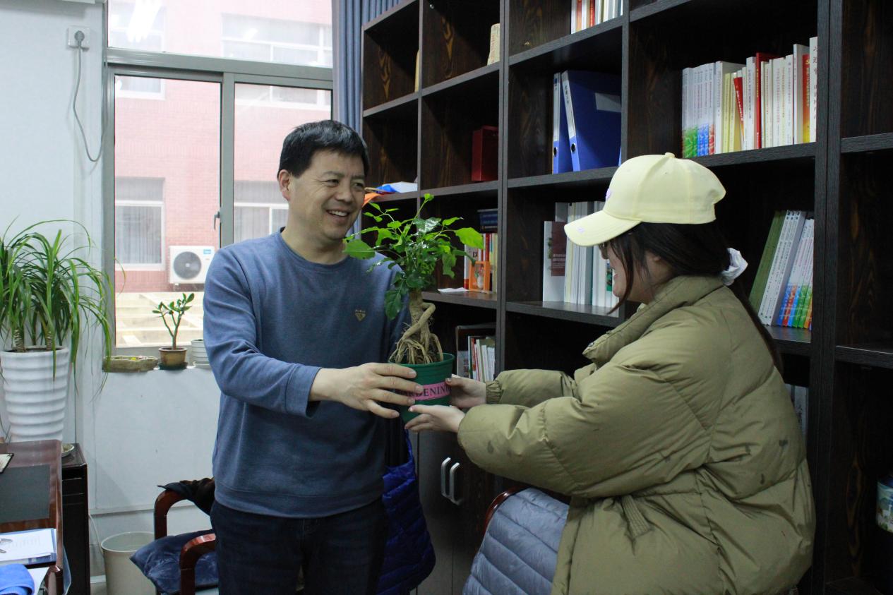 绿植敬师恩,芳菲润杏坛。以绿植为媒,将感恩教育与生态文明教育相结合,同学们向学院老师赠送文竹、绿萝等盆栽,将写满祝福话语的精美卡片系在每一盆绿植上,一笔一划的祝福,承载着同学们对老师的满满心意。这些绿植不仅是一份礼物,更是青春活力与美好希望的象征。辅导员张铎表示:“这份‘会生长的礼物’让师生情谊更添生机,推动了五育并举与校园生态文明建设同频共振。”