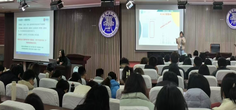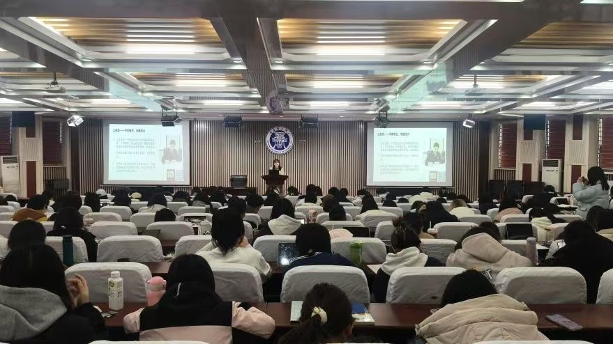 讲座聚焦就业规划全流程,围绕“就业压力应对”“职业路径选择”“求职实务技巧”三大模块展开。东海药业负责人结合学院各个专业近几年的就业现状和发展趋势,分析了当前就业市场的供需矛盾,详细讲解了简历优化、面试技巧等实用技巧。鹏展公考教育则针对公职考试热点,解析了公职考试的备考策略与岗位选择逻辑,并一一列举了公考、事业编、选调生等众多路径选择,提醒学生关注政策动向,提前规划行测、申论等科目的学习节奏。新东方前途出国负责人从留学申请视角出发,介绍了语言考试准备、院校选择及跨文化适应要点,鼓励学生拓宽视野,将国际化经历融入职业发展蓝图。此外,嘉宾们还就“面试中的自我介绍”“面试压力应对”“职业目标与个人价值观平衡”等话题进行互动答疑,现场气氛热烈。