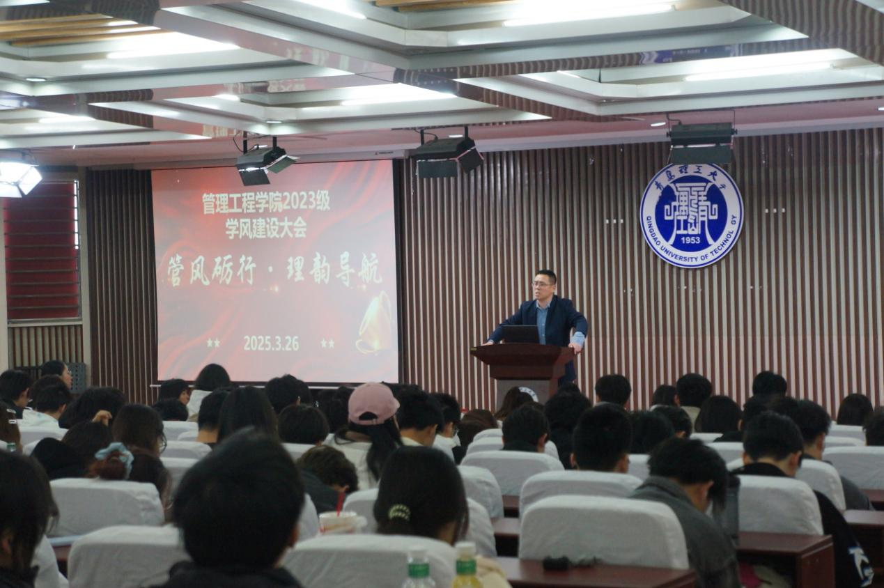 为进一步提升人才培养质量,夯实学院“管风理韵”品牌建设,打造风清气正、学风优良的育人环境,3月26日管理工程学院于主教学楼一楼西报告厅举行“管风砺行·理韵导航”2023级学风建设大会。副院长(主持工作)赵辉、各系主任、2023级辅导员、班主任、2023级全体同学参会,会议由学院党委副书记、副院长柳志广主持。