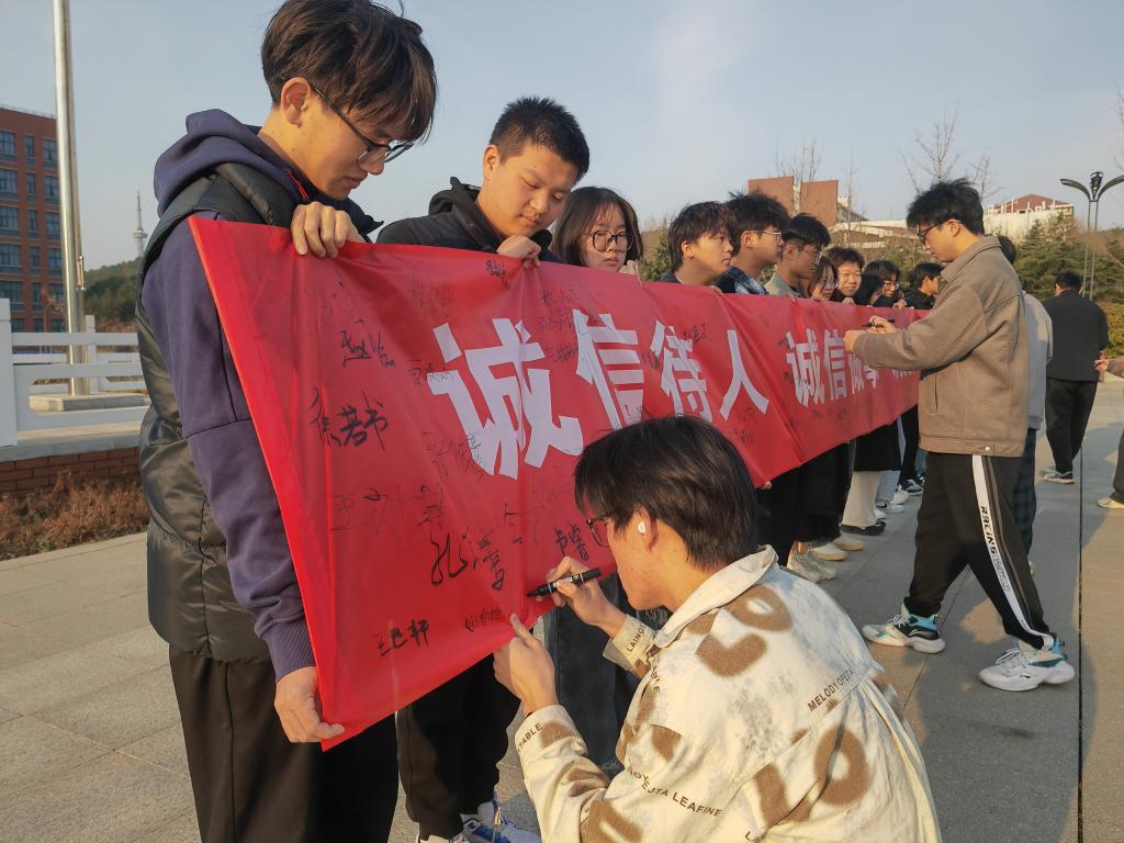 随后,在各班班长与团支书的引领下,参加升旗仪式的同学们有序在“诚信待人、诚信做事、诚信学习、诚信立身”的主题横幅上签下自己的名字,以笔为诺,许下恪守诚信、砥砺品行的坚定承诺。