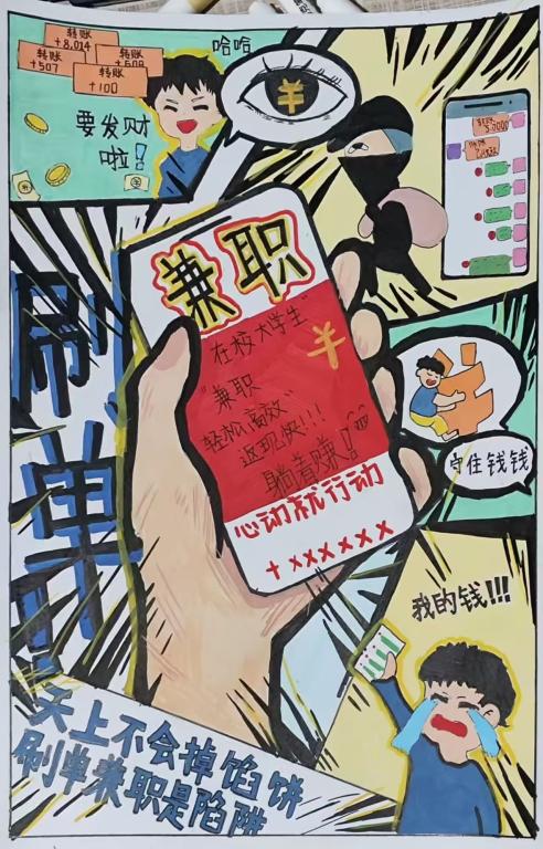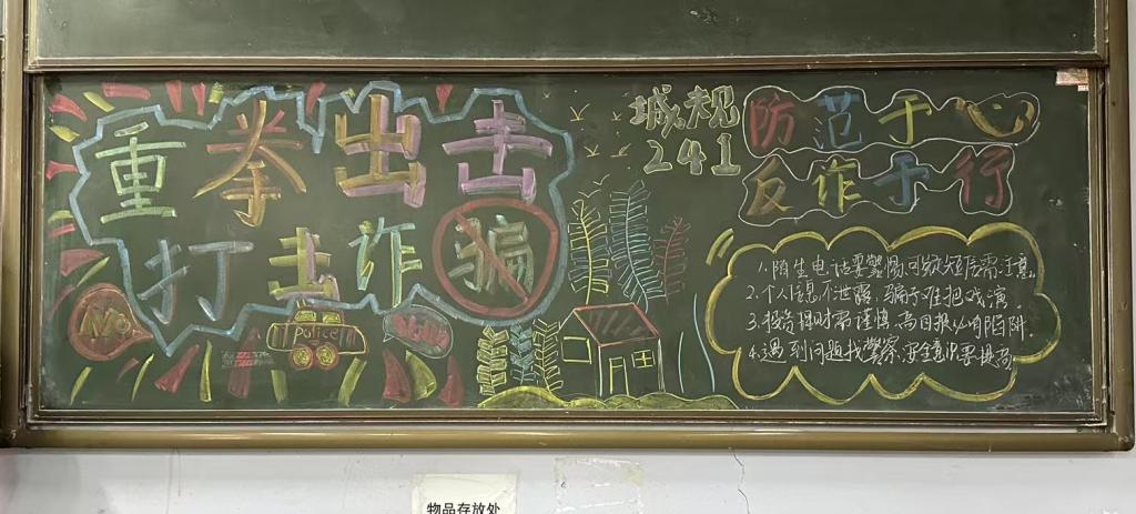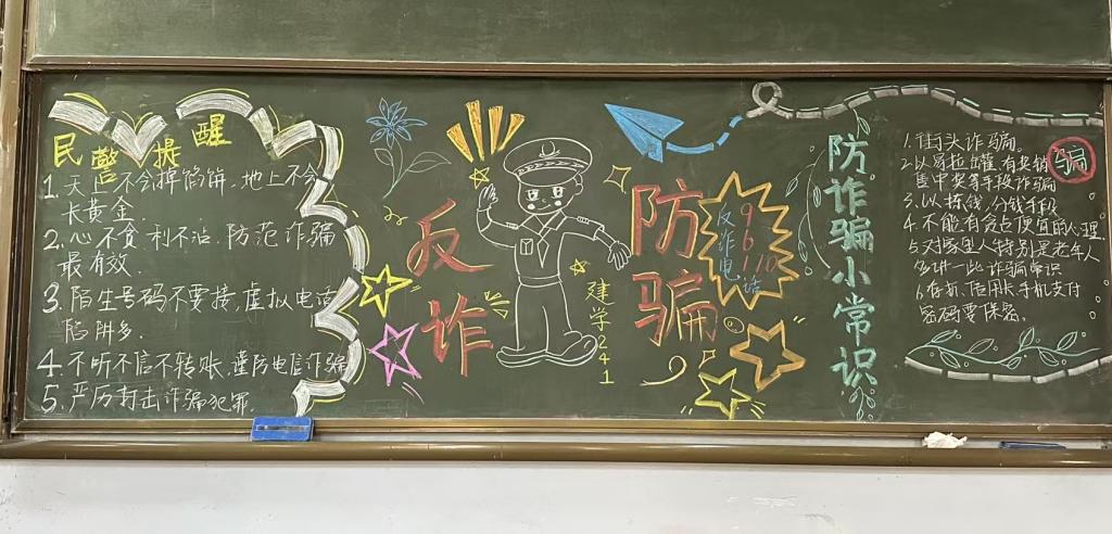 共绘防诈长卷,齐心守护校园。为筑牢校园反诈防线,学院开展“防范于心、反诈于行”黑板报创作大赛和防诈海报设计活动。同学们以画笔为盾,用构思巧妙的设计、震撼有力的标语,将防诈知识化作生动图像呈现在黑版报中;结合专业特长创作,用鲜明夺目的色彩,栩栩如生的图案,创作了主题鲜明的反诈作品,不仅能够有效地传达反诈信息,更在潜移默化中具有着深远的教育价值,助力学生们提升防范诈骗的意识和能力。