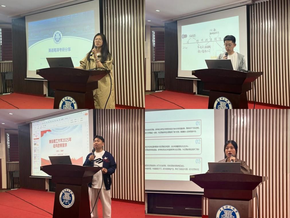 3月24日,学院积极搭建朋辈交流互助平台,邀请费军洁、王振宇等4位优秀学生代表进行征兵、西部计划及就业经验专题宣讲会。会上,西部计划志愿者费军洁以自身新疆生产建设兵团服务经历,呼吁同学们积极响应国家号召,在服务社会中实现人生价值。研2401班王振宇围绕2025年征兵政策,系统讲解了报名流程、入伍条件、高校毕业生“四优先”政策及退役后的升学就业优待措施,鼓励青年学子将个人理想融入国防事业,为强军梦注入青春力量。刘屹松结合自身求职经验,解密简历的撰写和简历投递技巧,强调“广撒网、多尝试”。张玉琦分享英语笔译考研经验,指出备考要提前规划,持之以恒,并针对考研各个科目做了详细的介绍和技巧分享。
