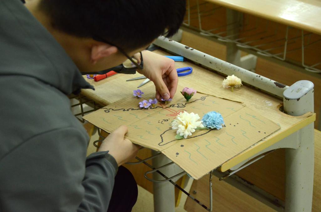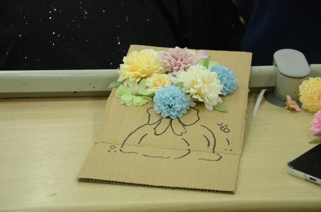 活动开始,主持人向同学们介绍了纸板插花活动的规则以及所需材料,同学们用马克笔画出各种形状的花瓶轮廓和人物形象随后将精心剪好的花朵巧妙地插到纸板上,每一件作品都蕴含着同学们的独特创意。