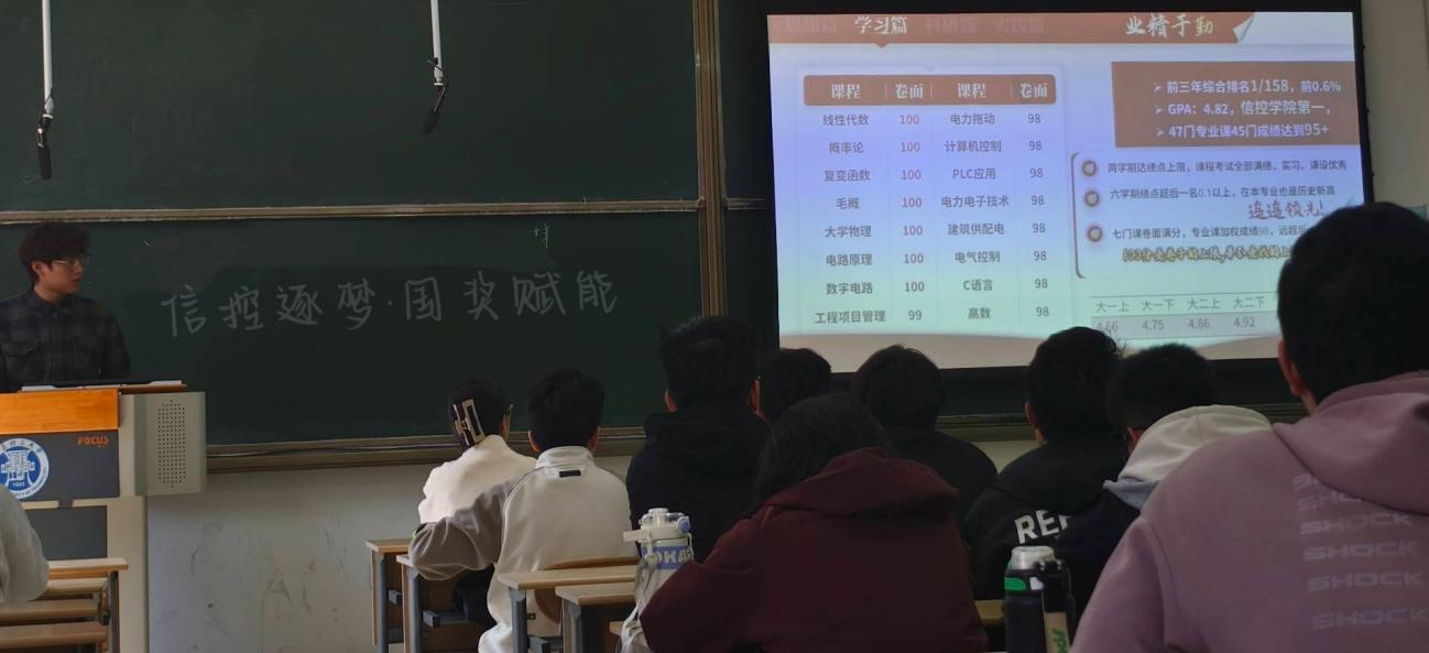 为激励同学们积极进取,助力学生在学业和科研道路上不断前行,信息与控制工程学院于4 月 16 日在 B105 教室成功举办了第一期“信控逐梦·国奖赋能”的国家奖学金经验分享会。本次活动特邀学院2021级电气工程及其自动化专业吴昊昱同学担任主讲嘉宾,其以专业排名1/158、GPA4.82的卓越成绩和丰富的科研竞赛成果,为同学们带来了一场精彩纷呈的成长盛宴。
