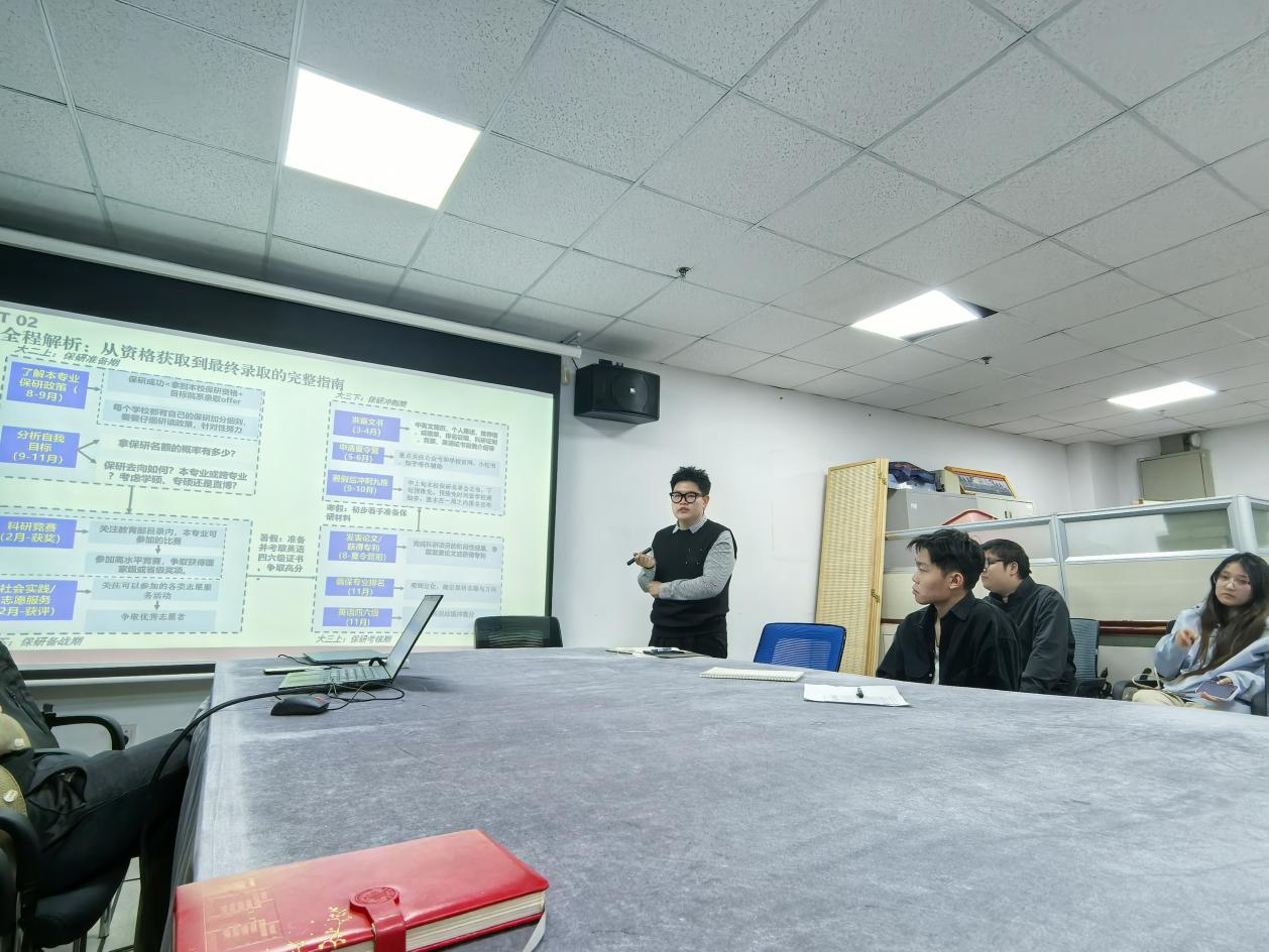 会议伊始,贾戈首先向同学们说明了召开此次座谈的目的,向同学们介绍了学院近年来促升学的系列举措,了解了同学们当前的备考想法及日后规划。随后,05级李廷强从考研的意义与目的入手,向大家详细介绍了考研的基本政策和备考策略,21级保研学生张君凯从保研角度深入分享了考研目标设定、院校及专业选择、备考计划制定、复习方法技巧等方面的宝贵经验。在互动交流环节,同学们积极提问,就考研过程中可能遇到的各种问题与校友们进行了深入探讨。针对同学们关心的问题,校友们结合自身经历和实际情况,一一给予了耐心、详细地解答。现场气氛热烈,同学们纷纷表示收获颇丰,对考研有了更清晰的认识和更坚定的信心。