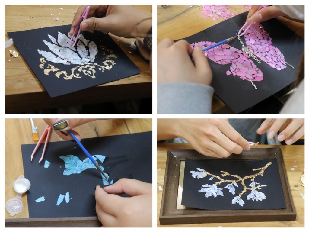 体味匠心手作,美育润泽心灵。在螺钿手作实践环节,师生需运用镊子将薄如蝉翼的螺片进行精细黏贴,这一过程对专注力和操作精度要求极高。师生们在专注于贝壳材料绚丽光影变化的同时,得以暂时消解学习生活中的压力,有效缓解心理焦虑。这种沉浸式体验不仅提升了学生对于传统工艺的审美能力,更通过实践过程中的自我调节,引导学生掌握心理调适方法,实现心灵滋养与成长。安全231班的张文博兴奋地说:“以前只是听说过螺钿工艺,这次通过自己亲手制作,虽然过程并不熟练,但看到贝壳碎片在自己手中变成精美的作品,特别有成就感。”