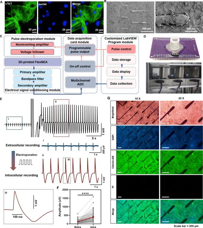 图2基于3D打印FlexNEA器件的电生理传感-调控系统及心肌胞内动作电位记录