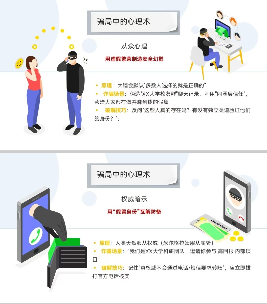 防御升级,解锁防骗“心”技能。该活动将传统防诈宣传升级为沉浸式攻防训练,通过“防诈心理小剧场”生动演绎不法分子诈骗的全过程,从“新用户首单立返30元”的小额诱饵,到“垫付返现”的虚假承诺,再到“账户冻结缴纳保证金”的恐吓套路,让学生直观感受诈骗分子的狡猾。随后,活动以小组讨论、案例分析等方式,深入剖析诈骗分子常用手段,提升学生防诈意识,传授防诈心理小技巧,为学生的生命和财产安全筑牢防火墙。