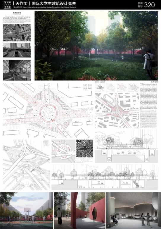 设计说明:本设计旨在通过重新组织交通将地面解放出来还给市民,粘结被分裂的社区,加强社区交流,打造便民商业、娱乐活动、自然运动、静谧植园等多主题的城市客厅。从调研出发,分析了该场地城市肌理与城市尺度,保留了场地原有的城市记忆,在原有作为立交桥中心绿植的区域设置秘境公园。将原先车行环形的空间分层次转换为人行空间,划分出适宜人体尺度的奔跑、慢行空间。对于地面层车辆驶入地下的入口处设置了阶梯入口,在缓和地面裂口的同时,兼做绿植看台,结合多样球场打造出停行并存的运动空间。将商业建筑推于桥下,不破坏广场纯净,并利用桥下空间。最后,通过一对环形红墙将中心秘境与城市环境隔开的同时,也填充垂直交通空间将市民引入地下的公共交通中心。